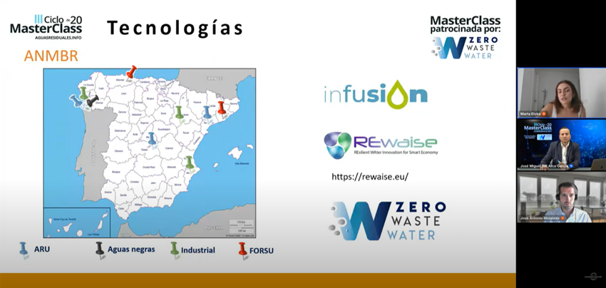 The goal of the masterclass was to present LIFE ZERO WASTE WATER, an EU-funded project that demonstrates a cost-effective solution to achieve a positive energy balance in wastewater treatment plants (WTTP). Firstly, José Antonio presented the LIFE ZERO WASTE project, emphasizing the importance of water treatment, and how water management needs to evolve to be climate neutral by 2045. He then introduced some of the benefits of the AnMBR (Anaerobic Membrane Bioreactor), which has been implemented in a WWTP in Valdebebas (Madrid), and then in El Bobar (Almería). Marta mentioned that the AnMBR has been tested as part of the REWAISE and the INFUSION projects and explained how this technology works and its benefits for the resource recovery process.