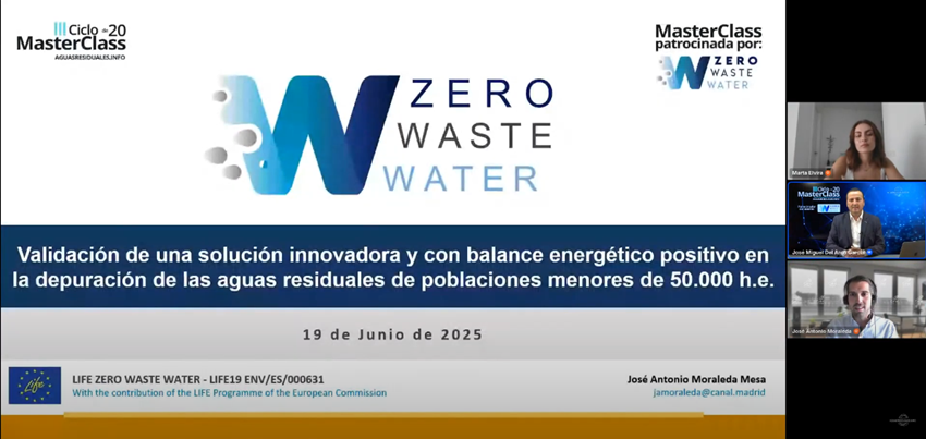 Last 19th of June, our coordinator Aqualia participated in a masterclass hosted by Aguas Residuales, a Spanish media specialised in wastewater management. Moderated by José Miguel del Arco, Founder and Director at Aguas Residuales, the guests for the masterclass were Marta Elvira, Researcher at the Innovation department of Aqualia, and José Antonio Moraleda, Responsible of promotion of Innovation at Canal de Isabel II. They presented “Paradigm shift and an innovative solution for wastewater treatment of populations with less than 50.000 inhabitants”.